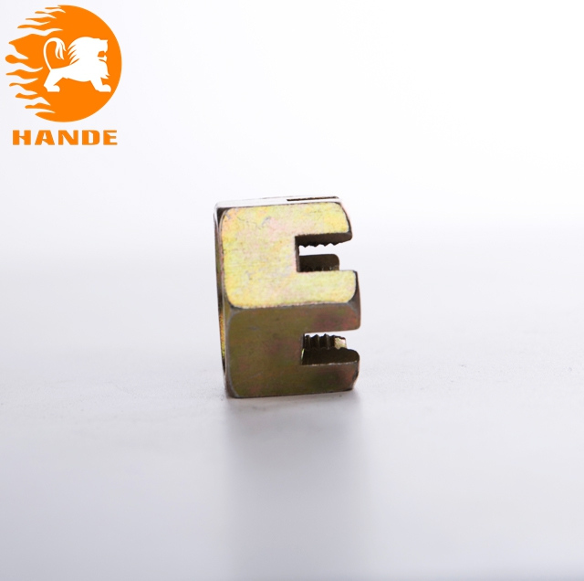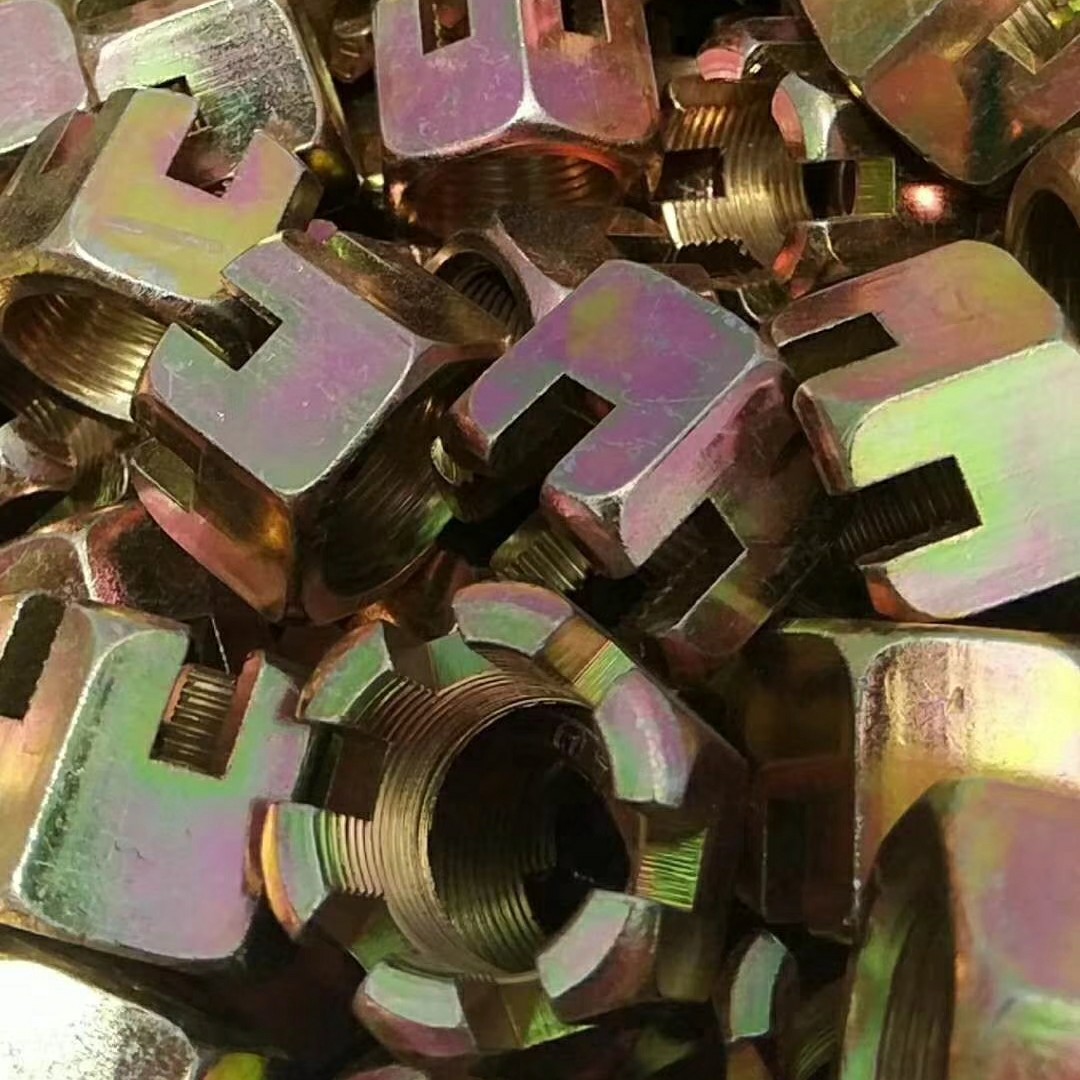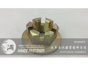 開槽螺母的作用:就是通過緊固穿過前后輪輪軸螺桿固定車輛前后輪軸,使車架和輪胎固定在一起,為了防止螺母松脫,必須用開口銷通過開槽螺母的槽進(jìn)行固定,而開口銷要固定住開槽螺母就必須從輪軸螺桿中間穿過,通常輪軸螺桿兩頭都需要鉆孔,孔的直徑大小和開槽螺母的槽寬和槽深決定了選用什么規(guī)格的開口銷,當(dāng)選用 的輪軸螺桿和開口銷和開槽螺母都比較匹配的時(shí)候,螺母就通過輪軸螺桿固定住前 輪和車架,開口銷通過輪軸螺桿的孔緊固件住了開槽螺母,使開槽螺母不產(chǎn)生松脫, 使車輛在運(yùn)動(dòng)的時(shí)候也不松脫.